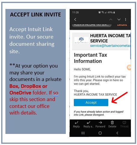 Tax preparation guidelines requires us to limit sharing personal information only through encrypted files or making information available in a secure site, similar to banking, insunance and other industries. Intuit Link is the parent company for many financial software solutions, e.g. TurboTax, Mint, QuickBooks, Lacerte and Proseries (Proseries is the software we use for tax preparation). They are extremely reputable and offer Intuit Link as an option to share files in a secure manner.